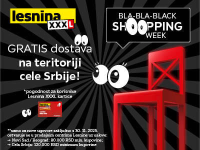 🏬 U prodajnim centrima (Beograd i Novi Sad) u periodu od 21. do 30. novembra za sve korisnike Lesnina XXXL kartice: besplatna isporuka za sve kupovine preko 80.000 RSD na teritoriji Beograda i Novog Sada, a na teritoriji cele Srbiji za 120.000 RSD minimalne kupovine.