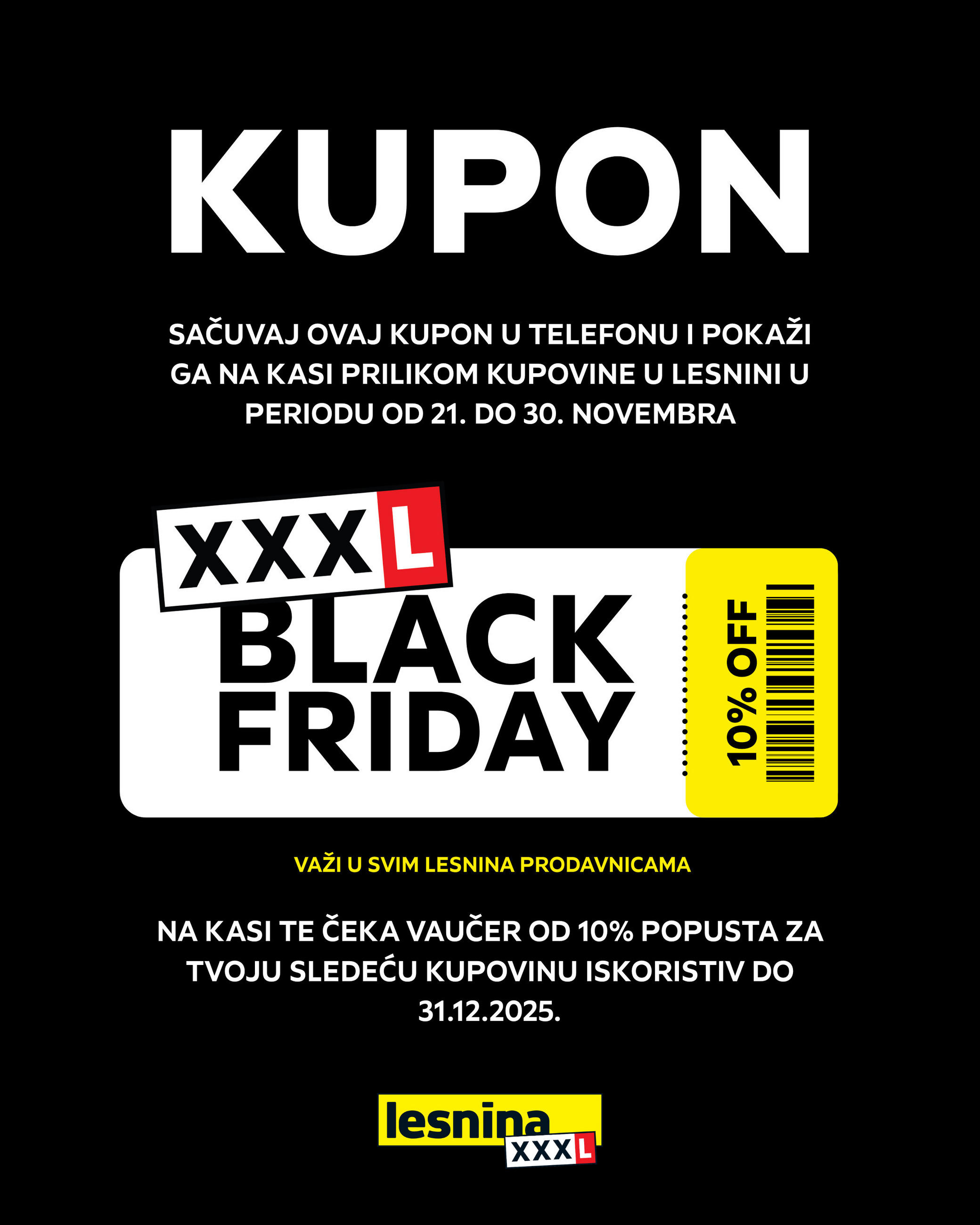 (Napomena: kupon važi uz fiskalni račun vaše prethodne kupovine i samo za kupovine realizovane u Lesnina prodajnim centrima tokom Black Friday nedelje i moguće je iskoristiti samo jedan kupon pri jednoj kupovini).